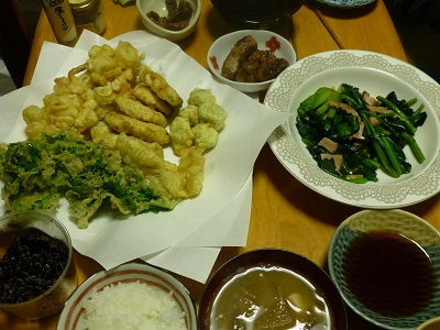 天ぷら(かぼちゃ、そら豆、菜花、エリンギ、にんにく、帆立・長ねぎ・長芋のかき揚げ)
