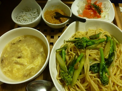 (スパゲティ、菜の花、アスパラ、にんにく、オリーブ油、唐辛子、しらす、からすみ、パルメザンチーズ、タバスコ)