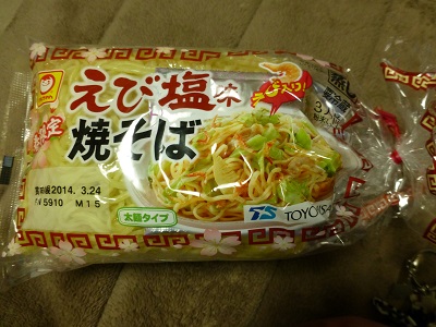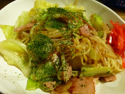 (えび塩味焼そば〔247kcal/1人前〕、ベーコン、キャベツ、もやし、玉ねぎ、青のり、紅生姜)