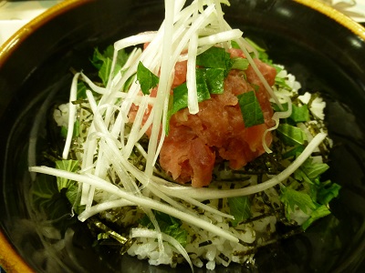 鮪のたたきには白髪ねぎ、しそ、海苔が散らしてあった。