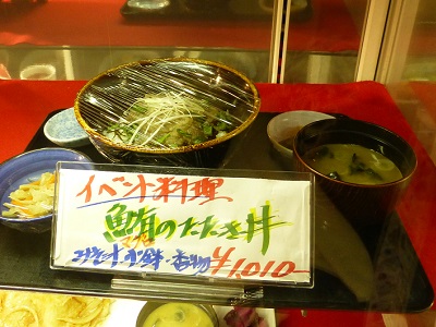 ショーウインドウには『イベント料理 鮪のたたき丼 みそ汁・小鉢・香物』