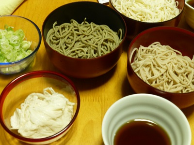 三色そば(そば、茶そば、温麺、めんつゆ、長ねぎ)