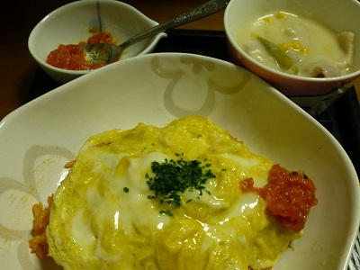 オムライス(ごはん、鶏肉、玉ねぎ、ピーマン、ケチャップ、バター、たまご、自家製トマトソース)