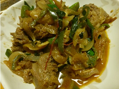焼肉炒め(コチュジャンカルビ焼肉@コストコ、玉ねぎ、ピーマン、にら)