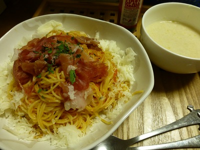 (カッペリーニ、自家製トマトソース、生ハム、パルミジャーノ、タバスコ)