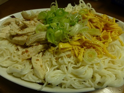 (そうめん、ささみ、錦糸卵、長ねぎ、かけつゆ[めんつゆ、牛乳、ラー油、すりごま])