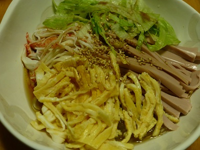 (ところてん、おさかなのソーセージ、錦糸卵、レタス、醤油ごま、酢、ポン酢)