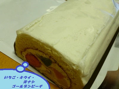 苺・キウイ・洋ナシ・ゴールデンピーチをロールケーキに限界まで巻きました。』