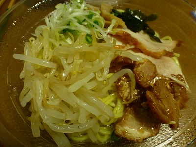 具には、もやし、ローストチキン、焼豚、ネギ、ワカメ、メンマ。