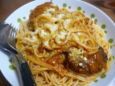 ハンバーグスパゲティ (スパゲティ・ハンバーグ・ミートソース・パルメザン・ホットチリ)
