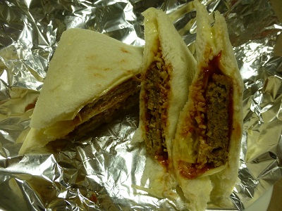 以前食べたランチパック黒胡椒香るハンバーグにチーズとケチャップを足してみる。