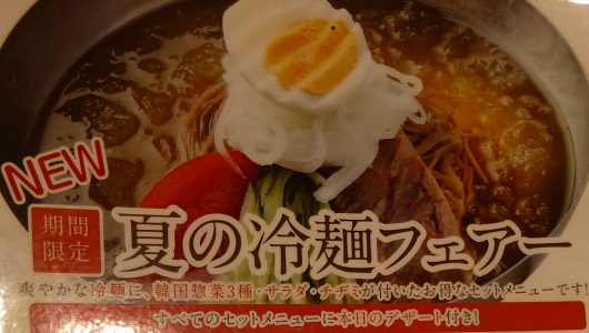 ちなみに冷麺に韓国惣菜3種・サラダ・チヂミ、本日のデザート付き。