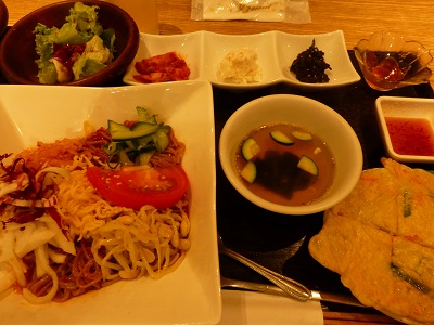 (野菜ビビン麺、チヂミ、わかめスープ、岩のり、サラダ、ゼリー)