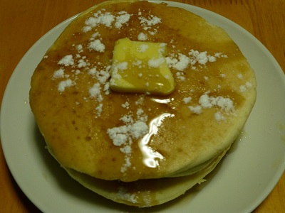 (パンケーキ2枚〔237kcal〕、メープル入りシロップ〔75kcal〕、パウダーシュガー〔3kcal〕)