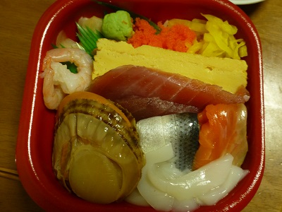 (酢飯、マグロ、サーモン、イカ、煮帆立、エビ、玉子、とびこ、たくわん、醤油、ガリ[コハダ抜き])