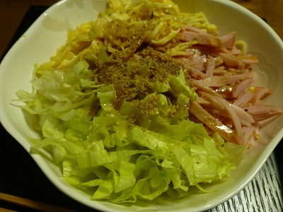(日清ラ王冷し中華ごまだれ〔365kcal〕、ハム、錦糸卵、レタス、ごまだれ専科)