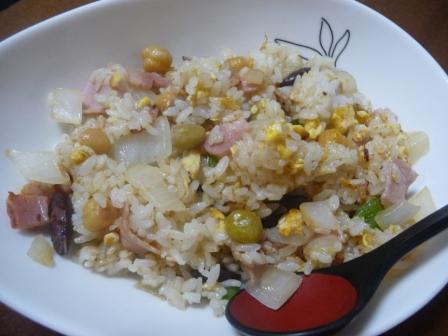 (ごはん、ベーコン、生ハム、たまご、ミックスビーンズ、玉ねぎ、ピーマン、バター)