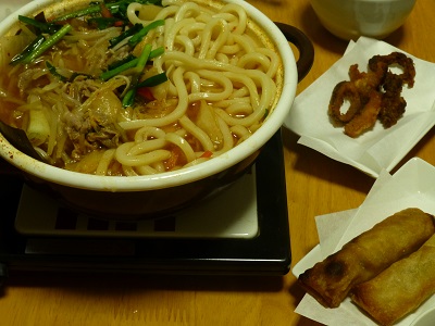 今日はうどんと野菜多めの鍋。肉は豚と牛のダブル。