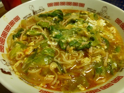 (明星 中華三昧 赤坂榮林 酸辣湯麺〔401kcal〕、たまご、ハム、玉ねぎ、レタス)