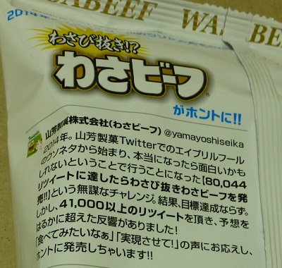 2014年。山芳製菓Twitterでのエイプリルフールのウソネタから始まり、本当になったら面白いかもしれないということで行うことになった【80,044ツイートに達成したらわさび抜きわさビーフを発売!!】と言う無謀なチャレンジ。結果、目標達成ならず。