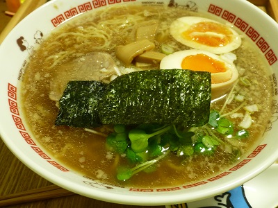 (中華麺、スープ、焼豚、ねぎ、かいわれ、海苔+煮玉子、小ねぎ)