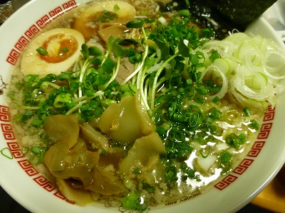 (中華麺、スープ、焼豚、メンマ、貝割れ、海苔、ねぎ+煮玉子、長ねぎ、小ねぎ、酢)