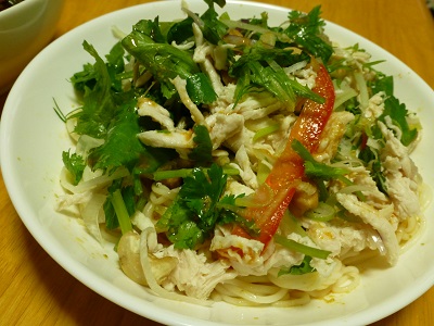 蒸し鶏とパクチーのやみつきサラダにそうめんをプラス。