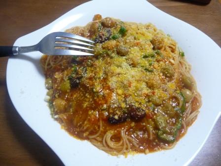 スパゲティとソースを絡めてから皿に盛り付け。 ずぼらスパゲティですw