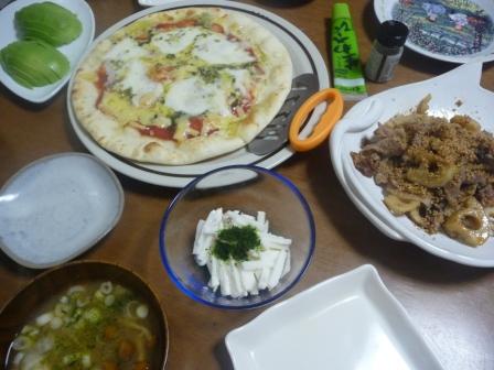 ピザでどっさり、焼きにく炒めでどっさりとカロリー摂取。