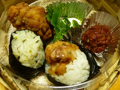 地雷也のお弁当〔317kcal〕(天むす、高菜おむすび、唐揚げ、肉団子)