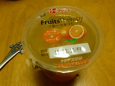 【フルーツセラピー バレンシアオレンジ】 販売元:フジッコ 購入場所:ワイズマート 価格:160円(税込 172円) 内容量:160g カロリー:105kcal ゼリーに果肉、ナタデココが入ってます。 変に甘すぎずフルーツの風味もフレッシュに感じられます。 ナタデココがいいアクセントになってました。