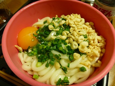 かま玉うどん〔535kcal〕(玉うどん1.5玉、卵黄、揚げ玉、小ねぎ、めんつゆ、ポン酢)