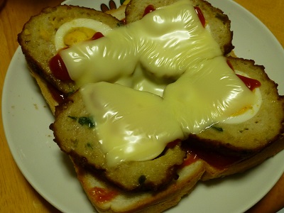 (食パン〔8切/131kcal〕、スコッチエッグ、チーズ〔56kcal〕、ケチャップ)