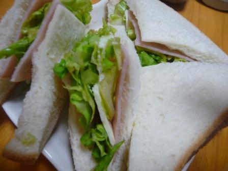 サンドイッチ:375kcal (食パン(8切・2枚)、チーズ、ハム2枚、キャベツの塩もみ