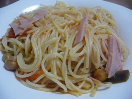 (スパゲティ90g、トマトとエリンギ、ミックスビーンズのアンチョビガーリックソテー、
