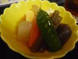 ふき入りの卵豆腐、冬瓜、にんじん、きぬさや、ふき、生麩、こんにゃく。
