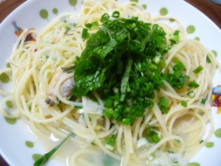 アサリのスパゲッティ:514kcal (スパゲティ100g、あさりの酒蒸し、バター、小ねぎ、しそ)