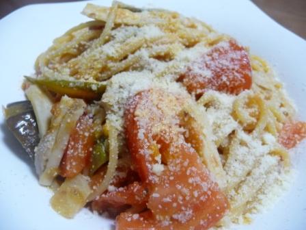 (スパゲティ120g、なすとトマト、アスパラガスのガーリックソテー、トマト、エリンギ