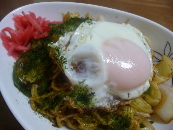 焼きそば:552kcal (焼きそば、豚肉、キャベツ、もやし、玉ねぎ、ピーマン、目玉焼き