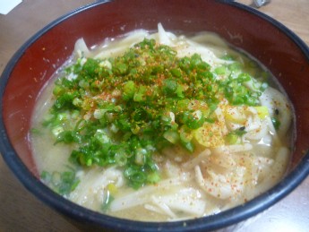 (玉うどん、玉ねぎとえのきのみそ汁、めんつゆ、長ねぎ、小ねぎ)