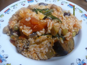 (ごはん180g、トマトとなす、ほうれん草とミックスビーンズのアンチョビガーリック炒め、