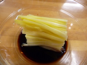 色を損なわないように、たまり醤油の上に黄ニラを盛り付けてあります。