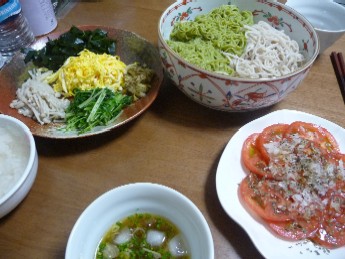 (そば、茶そうめん、めんつゆ、錦糸卵、焼きなす、水菜、えのき、わかめ、