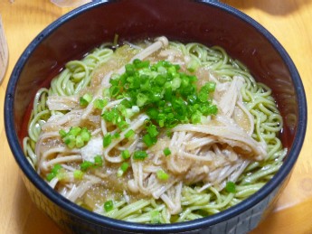 (茶そうめん〔茹で・100g〕、かけつゆ〔めんつゆ、えのき、長ねぎ、大根おろし〕、小ねぎ)