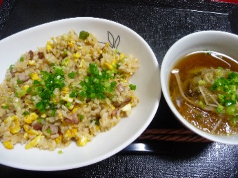 焼豚炒飯:608kcal (ごはん、焼豚、たまご、長ねぎ、小ねぎ、サラダ油、調味料)