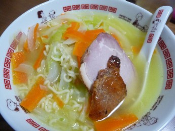 野菜しおラーメン:521kcal (サッポロ一番塩、焼豚、キャベツ、玉ねぎ、にんじん)