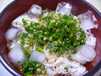 ぶっかけそうめん:257kcal (そうめん、めんつゆ+黒酢、揚げ玉、小ねぎ、しそ)