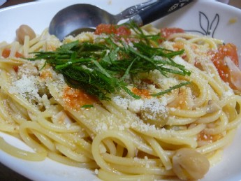 (スパゲティ、トマト、ミックスビーンズ、エリンギ、にんにく、オリーブ油、パルメザンチーズ、しそ、タバスコ)