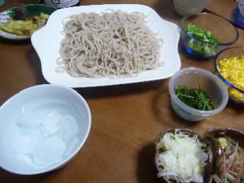 (そば、めんつゆ、錦糸卵、焼きなす、おくら、長ねぎ、しょうが、しそ、みょうが、すりごま)