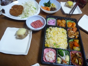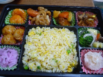 (炒飯、肉団子2.5個、エビチリ〔エビ1個〕、鶏とカシューナッツ炒め〔鶏1個〕、酢豚〔豚1個〕